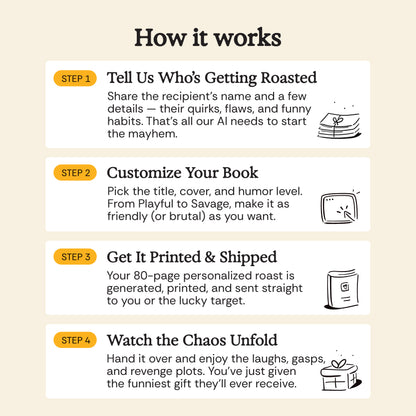 • 1 Personalized Roast Book — 80 pages of laugh-out-loud storytelling written entirely by AI, starring your chosen victim.