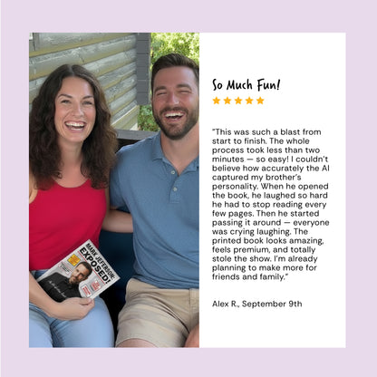 No, the books you create using our service are strictly intended as gag gifts and for entertainment purposes only. They are not meant to be taken seriously and should not be used for commercial purposes or as a source of factual information. These books are purely for fun, to bring a smile to someone’s face, and to make a memorable, humorous gift!